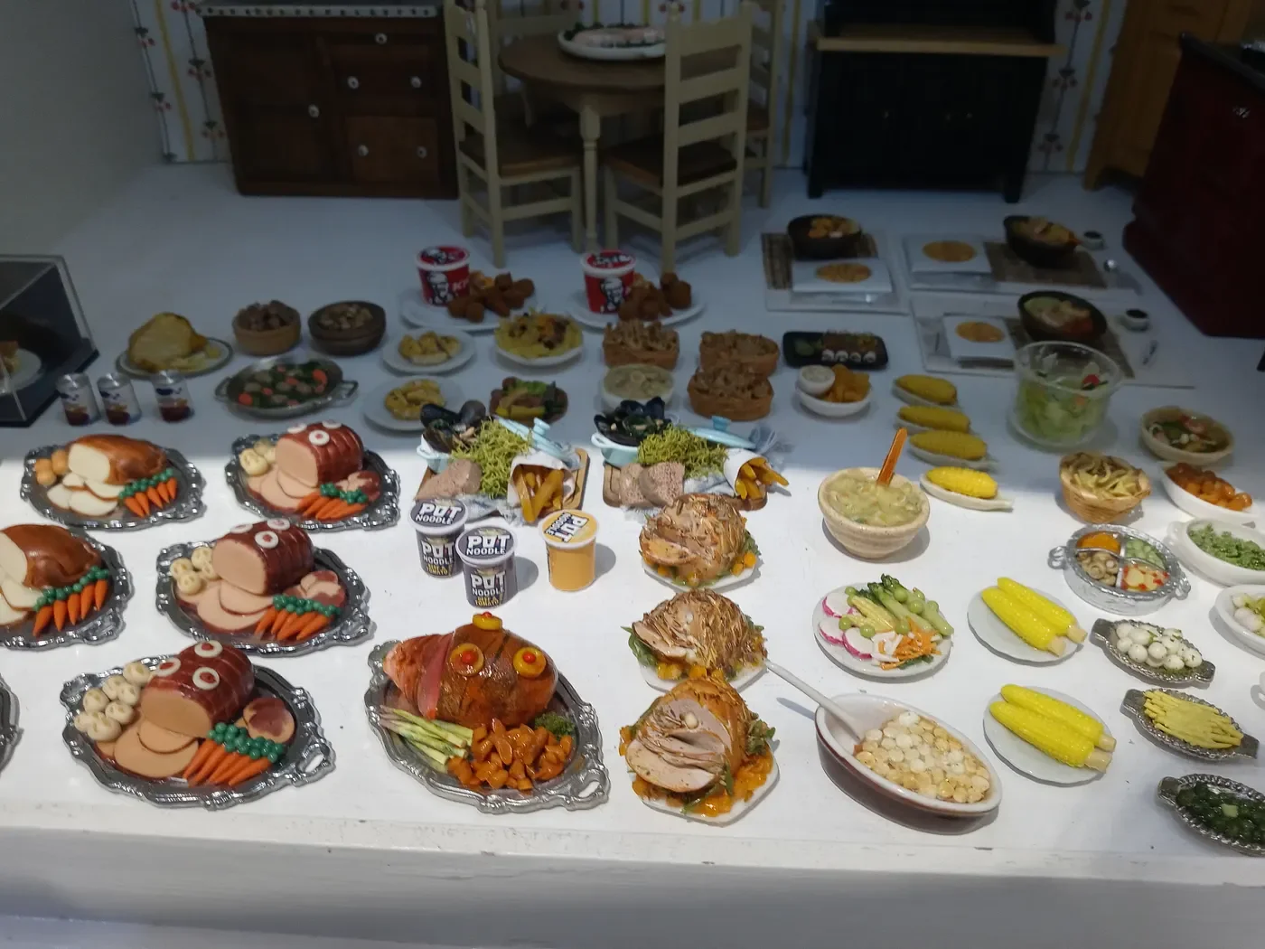 But it turns out there is indeed one person in Manhattan who can keep a storefront open serving this small niche hobby of building and filling small niches. We hit up the Tiny Doll House, and while Viki browsed amazing things like this handful of banquet: