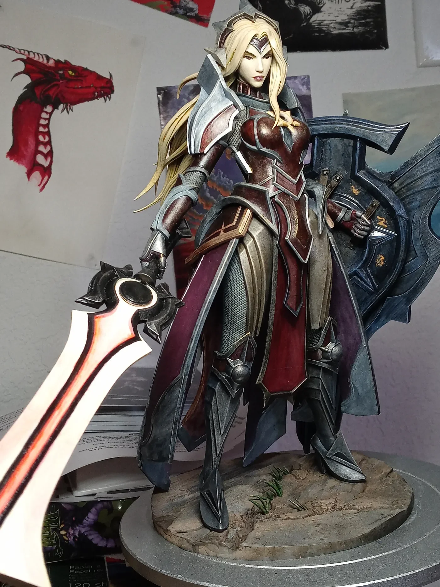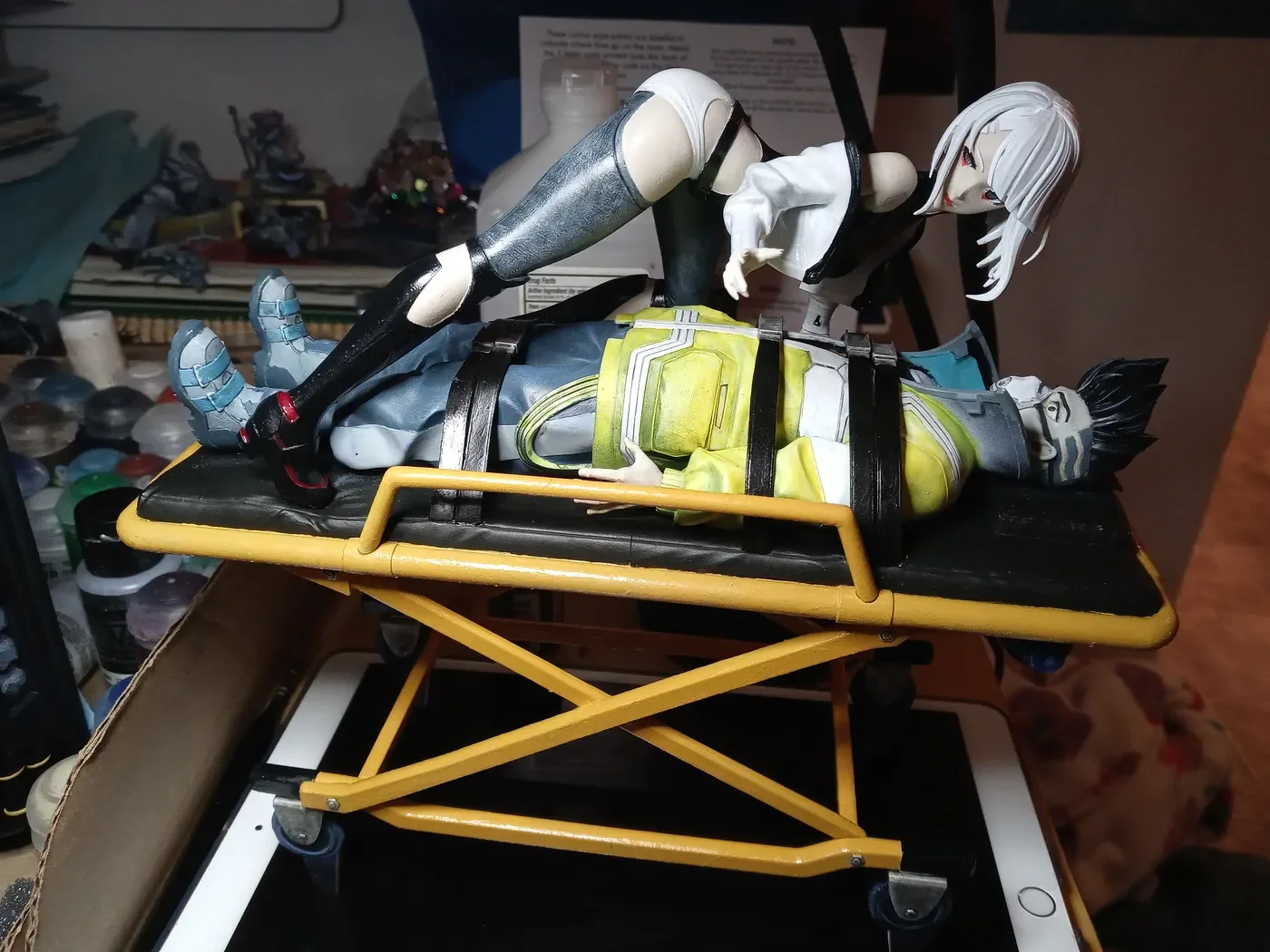 2B from Nier Automata. She’s standing on her toes on nearly vertical supports, she’s got two incredibly delicate swords held out at different angles, and then there’s that lil robot on a cable hovering next to her. All of that’s got to be swaddled and padded in case your mailman kicks her down the stairs. It’s murder, not gonna lie. We spend a lot on bubble wrap. But I’ve never had a complaint — we know how to safely transport a lady, never fear!